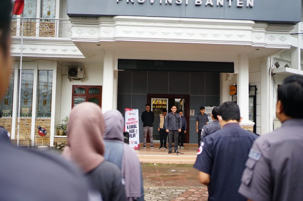 Ketua Bawaslu Provinsi Banten Ali Faisal saat menjadi Pembina Apel Patrolu Pengawasan Kawal Hak Pilih, Senin (27/02/2023)