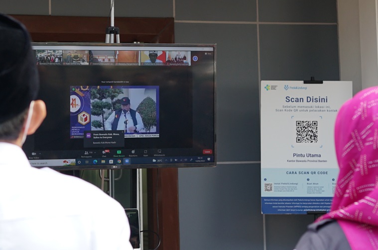 Serang-Badan Pengawas Pemilihan Umum Provinsi Banten Ikuti Kegiatan Apel Siaga Pengawasan Pemilu 2024 secara virtual yang digelar Badan Pengawas Pemilihan Umum (Bawaslu) RI secara serentak yang melibatkan Bawaslu Provinsi dan Bawaslu Kabupaten/Kota seluruh Indonesia pada Selasa (14/6/2022).