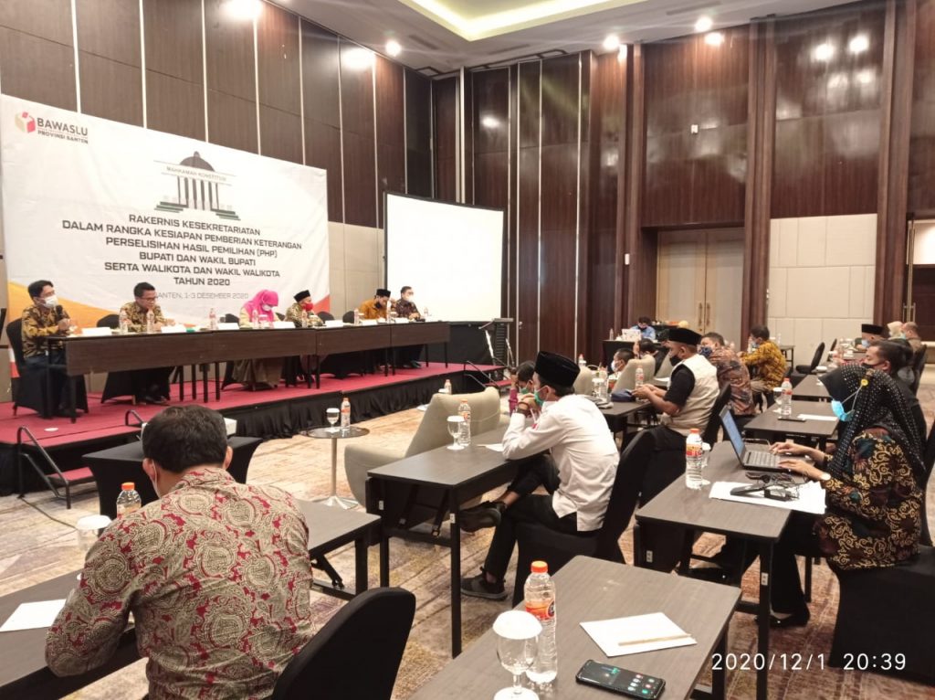 Badan Pengawas Pemilihan Umum (Bawaslu) Provinsi Banten Persiapkan Bawaslu Kabupaten/Kota yang melaksanakan Pilkada untuk kemungkinan menghadapi adanya perselisihan hasil pemilihan (PHP) pada pemilihan kepala daerah tahun 2020 melalui kegiatan rapat kerja teknis (rakernis) Kesekretariatan dalam Rangka Kesiapan Pemberian Keterangan Perselisihan Hasil Pemilihan (PHP) Bupati dan Wakil Bupati serta Walikota dan Wakil Walikota Tahun 2020 di Provinsi Banten yang dilaksanakan di Hotel Swiss Bell Cikande dari tanggal 1-3 Desember 2020.
