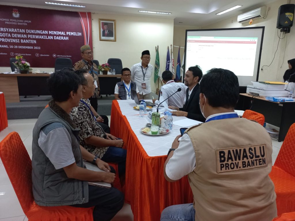 Serang, Bawaslu Provinsi Banten – Saat ini tahapan Pemilu Tahun 2024 memasuki tahapan penyerahan dokumen persyaratan dukungan dan sebaran minimal Bakal Calon Anggota Dewan Perwakilan Derah Republik Indonesia (DPD RI). Sesuai dengan amanat UU Nomor 7 Tahun 2014 tentang Pemilihan Umum, Bawaslu Provinsi Banten bertugas melakukan pengawasan terhadap pelaksanaan tahapan Penyelenggaraan Pemilu termasuk di dalamnya tahapan penyerahan dokumen persyaratan dukungan dan sebaran minimal Bakal Calon Anggota DPD RI. Tujuan dari dilakukannya pengawasan ini adalah untuk memastikan kesesuaian prosedur pelaksanaan sub tahapan penyerahan dukungan minimal pemilih serta kelengkapan dan kesesuaian dokumen persyaratan dukungan dan sebaran minimal yang diserahkan oleh Bakal Calon Anggota DPD RI.