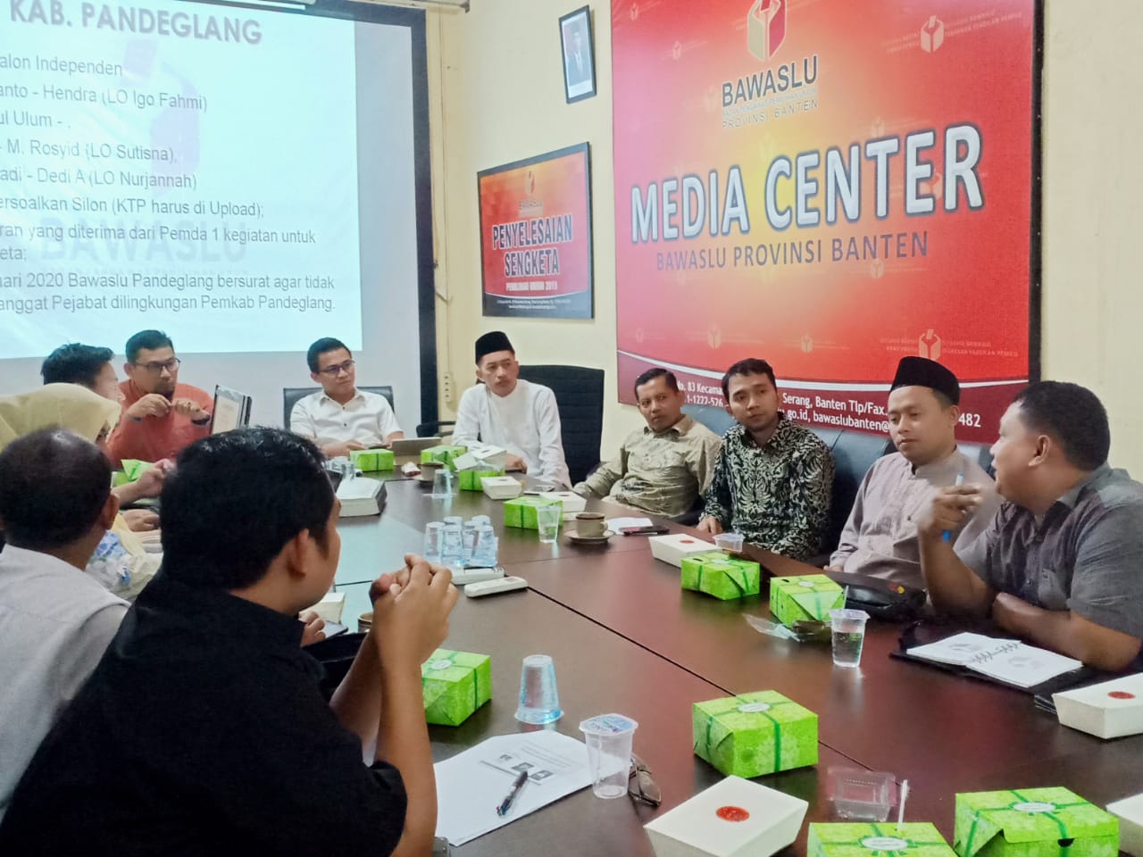Bawaslu Provinsi Banten pada hari ini, Jum'at (31/01/2020), menggelar rapat Inventarisir Potensi Penyelesaian Sengketa Pemilihan pada Pemilihan Bupati dan Wakil Bupati serta Walikota dan Wakil Walikota tahun 2020 di Ruang Rapat Kantor Bawaslu Provinsi Banten yang melibatkan 4 (empat) Bawaslu Kabupaten/Kota yang akan melaksanakan Pilkada tahun 2020. Hadir sebagai pimpinan rapat Komisioner Bawaslu Provinsi Banten Koordinator Divisi Penyelesaian Sengketa, Ali Faisal, dan Koordinator Divisi Penindakan Pelanggaran, Badrul Munir.