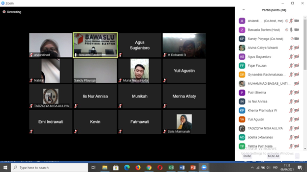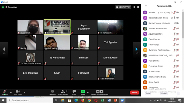 Serang, pada tanggal 8 April 2021 Badan Pengawas Pemilihan Umum Provinsi Banten kembali melaksanakan Kuliah Kepemiliuan, dikarenakan dalam suasana pandemi, kuliah kepemiluan kali ini masih menggunakan pertemuan virtual. Pada kesempatan kali ini, Bawaslu Provinsi Banten bekerjasama dengan Universitas Sultan Ageng Tirtayasa Progam Jurusan Administrasi Publik menggelar kuliah kepemiluan dengan tema Logistik Pemilu, kegiatan ini diikuti oleh 104 mahasiswa Jurusan Adminitrasi Publik Fakultas Ilmu Sosial BUdaya Universitas Sultan Ageng Tirtayasa.