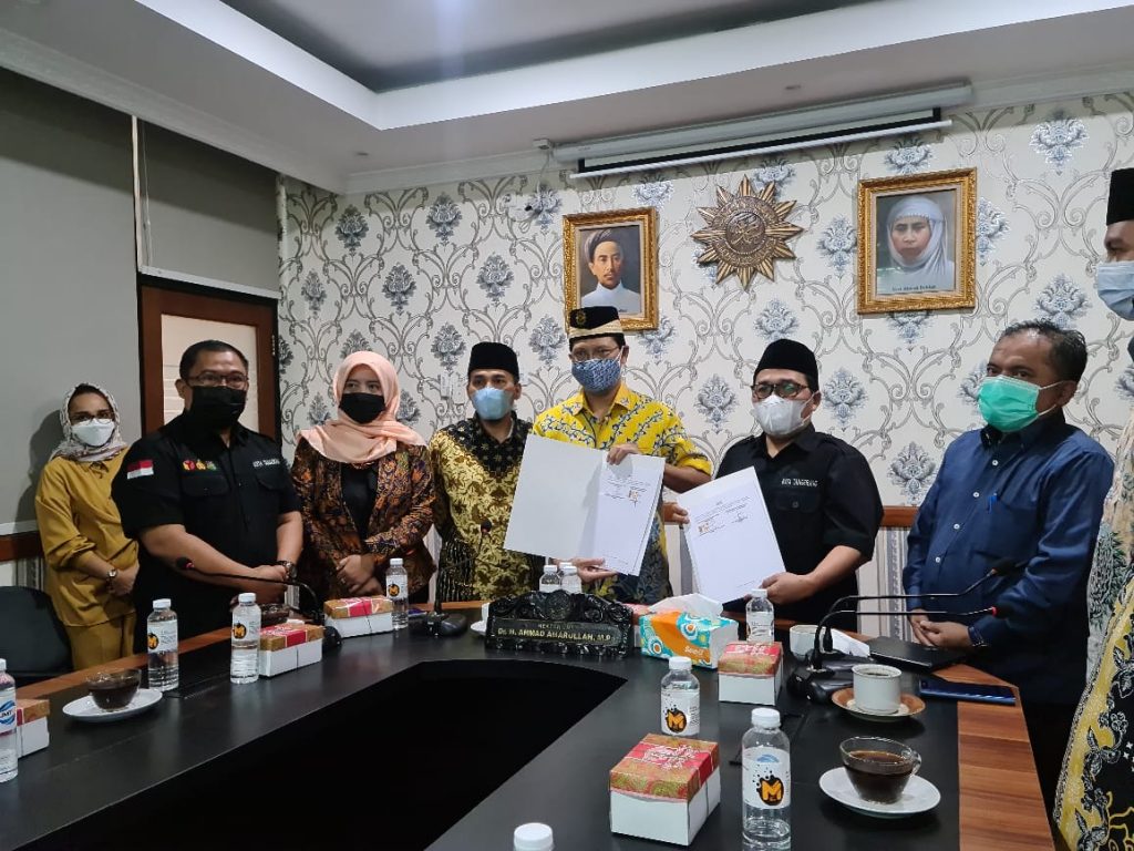 Penandatanganan dilakukan oleh Rektor UMT Dr. H. Ahmad Amarullah, M.Pd dan oleh Ketua Bawaslu Kota Tangerang Agus Muslim.