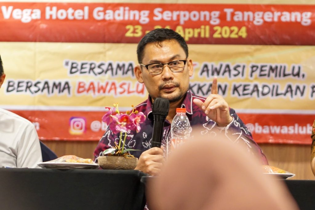 Ketua Bawaslu Provinsi Banten Ali Faisal Saat Membuka Rapat Evaluasi Pembinaan Aparatur Pengawas Adhoc Pemilu Tahun 2024, Selasa (23/04/2024). Foto: Devara Febrydo B