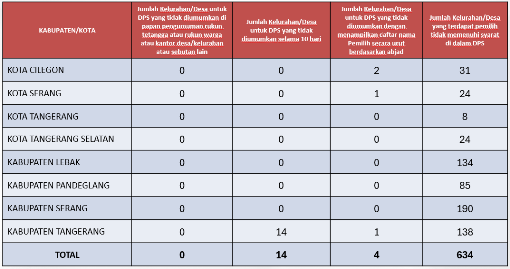 Pertama, tidak diumumkannya DPS sesuai ketentuan. Ali mengatakan terdapat 14 kelurahan/desa yang tidak mengumumkan DPS selama sepuluh hari, sedangkan empat kelurahan/desa lainnya tidak mengumumkan DPS dengan menampilkan daftar nama Pemilih secara urut berdasarkan abjad. Padahal berdasarkan Pasal 34 Peraturan Komisi Pemilihan Umum (PKPU) Nomor 7 Tahun 2024 tentang Penyusunan Daftar Pemilih dalam Penyelenggaraan Pemilihan Gubernur dan Wakil Gubernur, Bupati dan Wakil Bupati, serta Walikota dan Wakil Walikota, kata Ali, salinan DPS per TPS harus diumumkan di papan pengumuman RT, RW, kantor desa/kelurahan, atau sebutan lain selama 10 (sepuluh) Hari dengan menampilkan daftar nama Pemilih secara urut berdasarkan abjad.