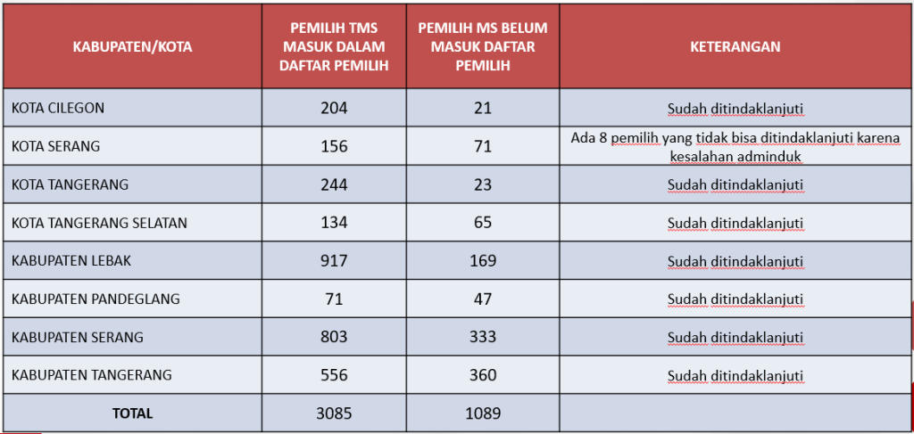 Sementara itu, Koordinator Divisi Pencegahan dan Partisipasi Masyarakat Bawaslu Provinsi Banten Ajat Munajat mengungkapkan jumlah pemilih TMS dan MS tersebut telah diteruskan ke KPU secara berjenjang dan telah ditindaklanjuti. Akan tetapi, pihaknya mencatat terdapat delapan pemilih di Kota Serang yang masih terkendala lokasi penempatan TPS karena masalah administrasi kependudukan.