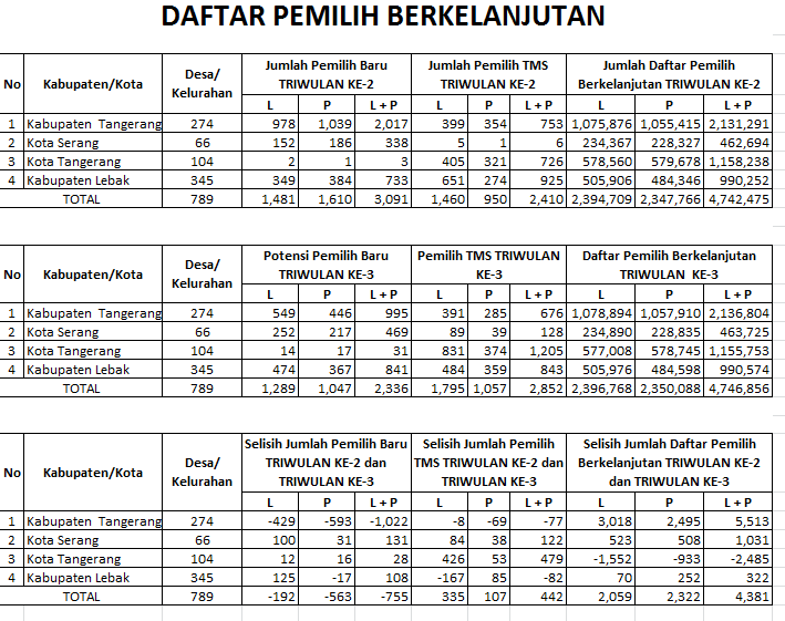 Bawaslu Provinsi Banten menghitung selisih Data Rekapitulasi DPT Berkelanjutan dari triwulan kesatu – ketiga untuk diketahui dan sebagai berikut :
