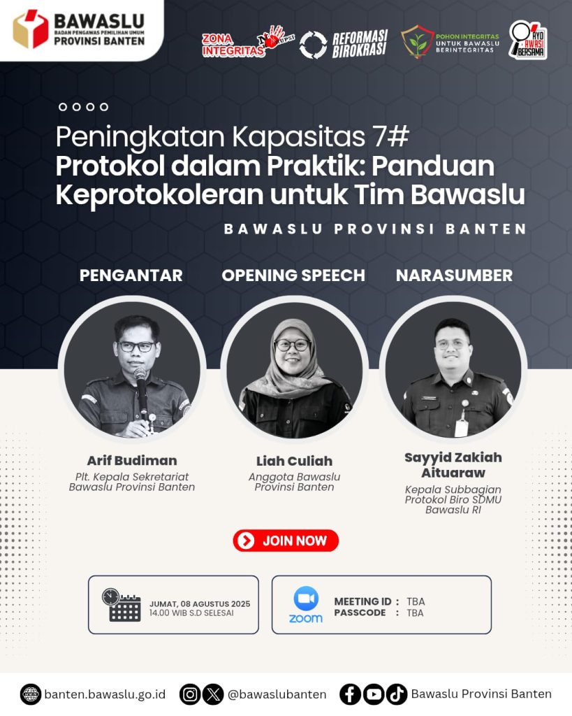 Media Promosi Kegiatan Peningkatan Kapasitas Seri #7 dengan tema “Protokol dalam Praktik: Panduan Keprotokolan untuk Tim Bawasluâ€, Jumat (8/8/2025).