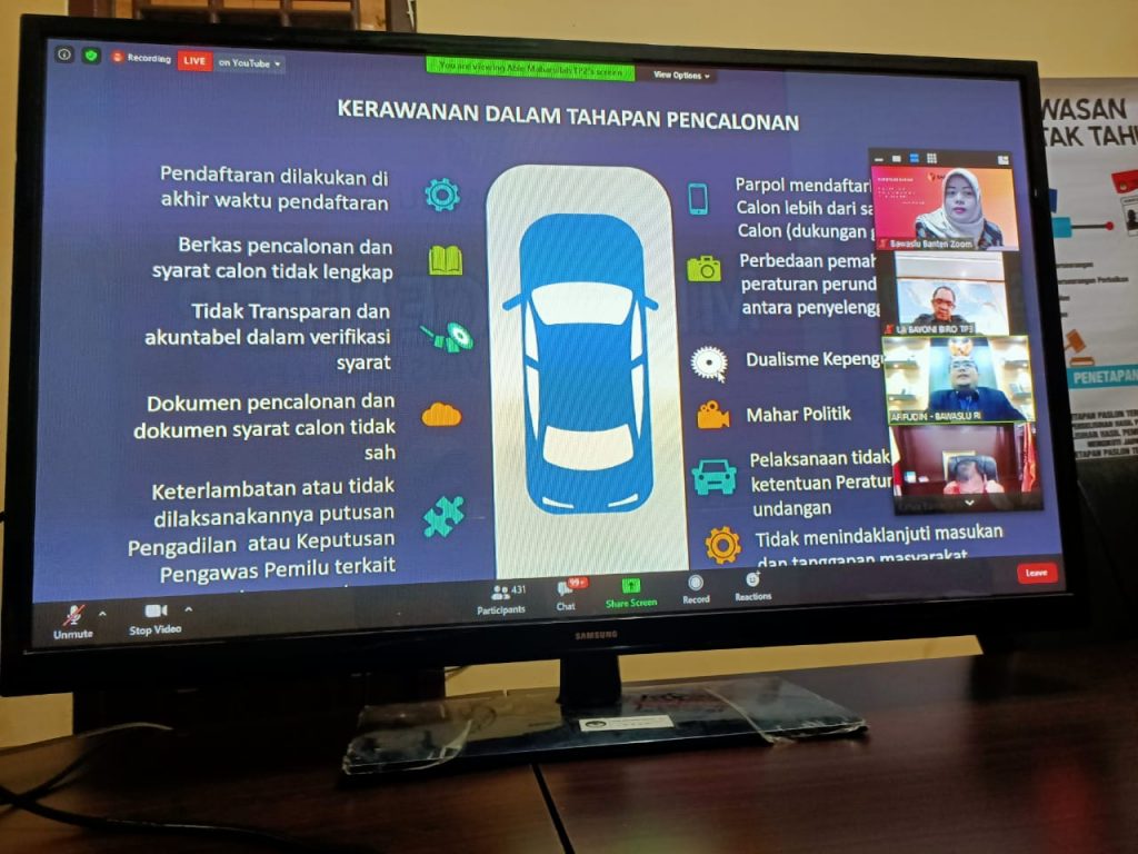 Serang, Badan Pengawas Pemilihan Umum Provinsi Banten mengikuti Rakornas dalam jaringan Pengawasan Tahapan Pencalonan yang diselenggarakan oleh Bawaslu RI, Selasa (01092020). Kegiatan yang dilakukan secara daring ini dihadiri oleh jajaran Bawaslu Provinsi se-Indonesia.