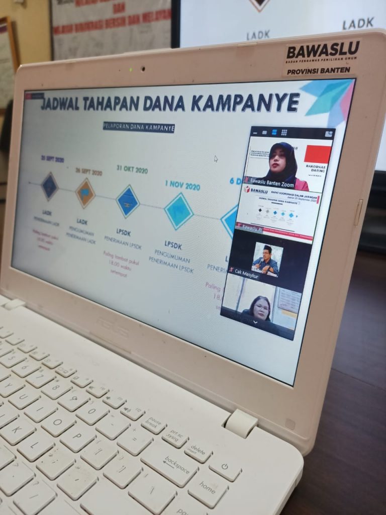 Banten - Koordinator Divisi Pengawasan dan Hubungan Antar Lembaga Bawaslu Provinsi Banten hadir dalam kegiatan rapat yang diadakan oleh Bawaslu RI secara Daring pada hari Jum'at (25/9/2020). Pelaksanaan Pemilihan Serentak tahun 2020 memiliki tantangan tersendiri, karena dilaksanakan bersamaan dengan adanya pandemi Covis-19. PKPU Nomor 13 Tahun 2020 mensyaratkan pelaksanaan kampanye dengan memperhatikan penegakan disiplin penerapan protokol kesehatan pencegahan Covid-19.