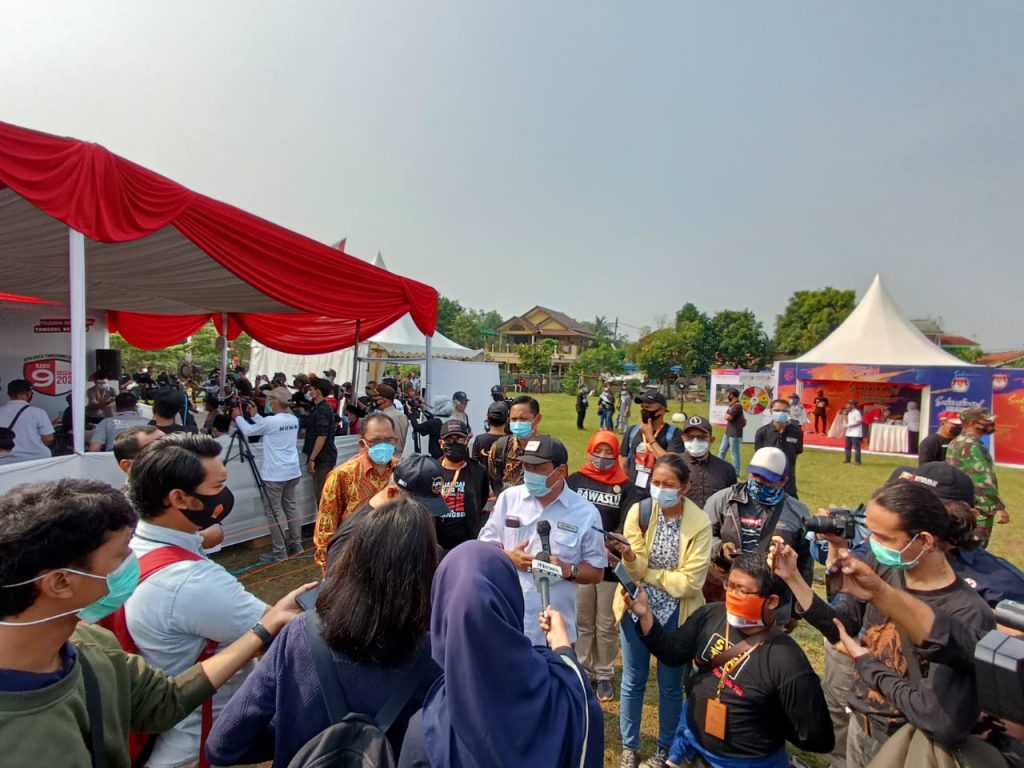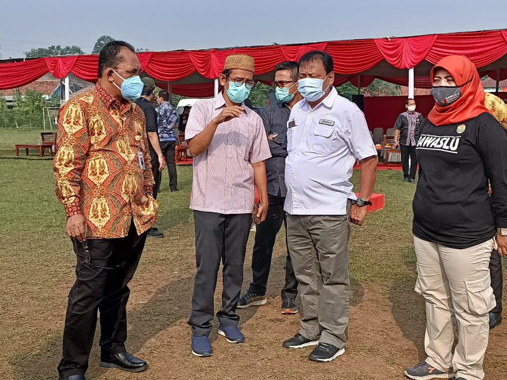 TANGSEL-Badan Pengawas Pemilihan Umum (Bawaslu) berikan saran perbaikan dalam pelaksanaan Simulasi Pemungutan Suara dalam Pemilihan Serentak 2020 dengan Protokol Kesehatan, Pencegahan dan Pengendalian Covid-19 yang digelar Komisi Pemilihan Umum (KPU) di Desa Cilenggang, Kota Tangerang Selatan. Sabtu, (12/9/2020).