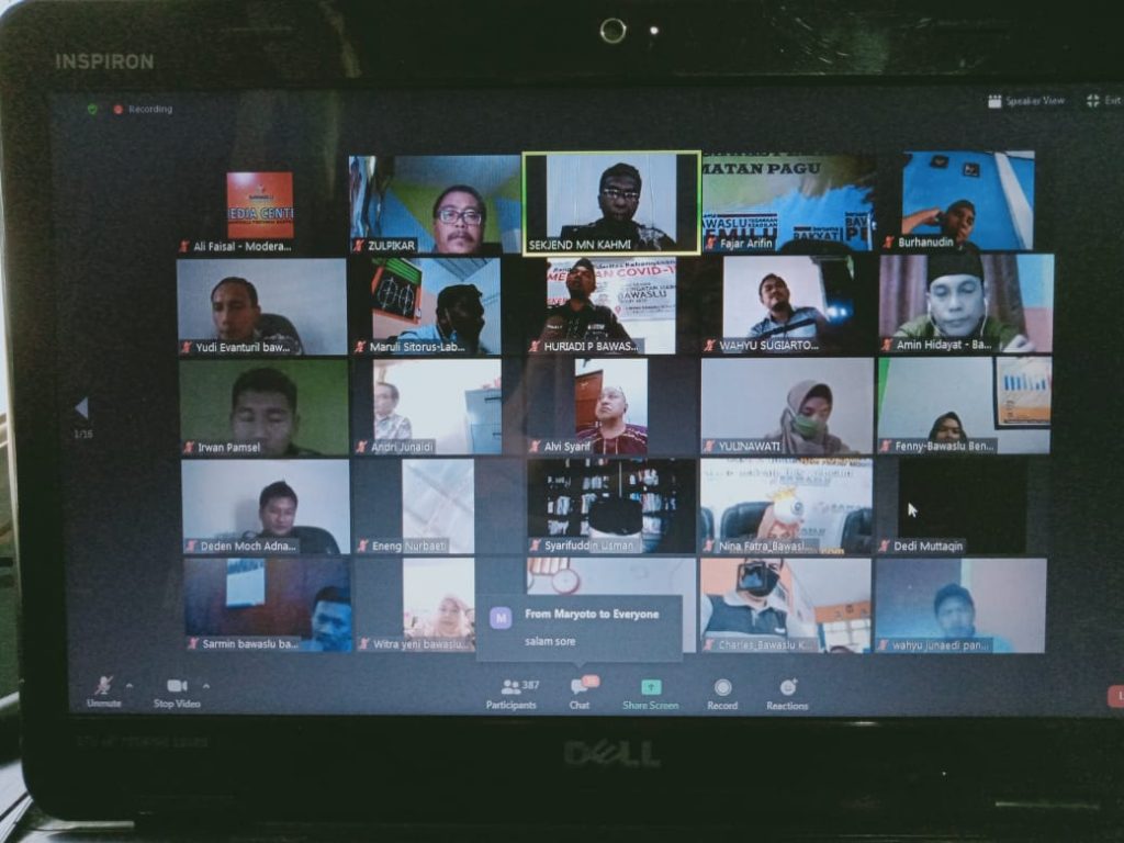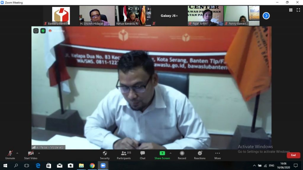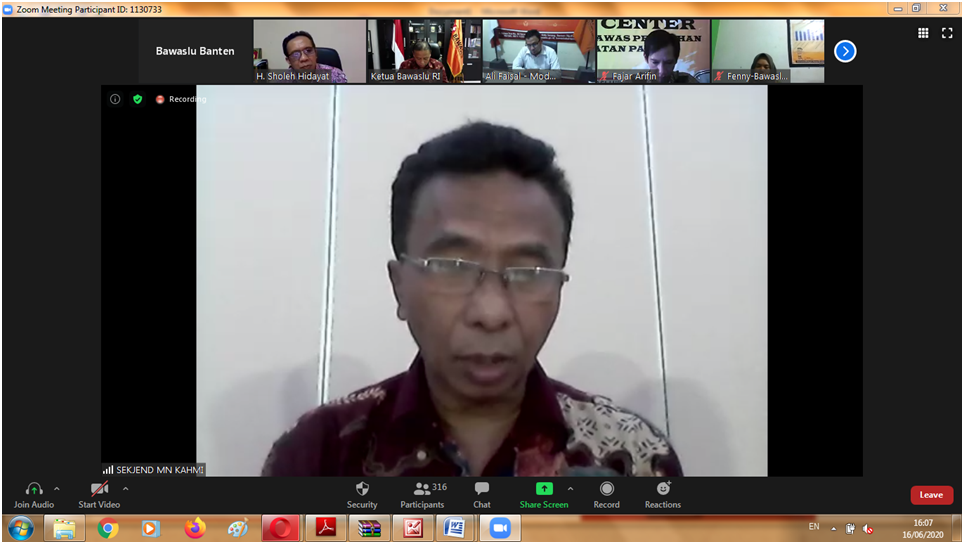 Serang, 16/07/2020. Bawaslu Provinsi Banten mencatatkan rekor peserta Webinar tertinggi, tercatat 387 orang dari berbagai wilayah di Indonesia, dari Aceh hingga Papua yang berasal dari kalangan Pengawas pemilu berbagai tingkatan, para akademisi, pegiat dan pemerhati, lembaga swadaya masyarakat dan lain-lain. Webinar ini sengaja dibuat oleh Bawaslu Provinsi Banten dengan tajuk "Menyongsong Pilkada di Masa Normal Baru" Seperti kita ketahui, sejak terjadinya pandemi corona, pilkada yang telah dirancang-rencanakan jauh-jauh hari terpaksa dihentikan tahapannya oleh KPU pada 21 maret, setelah KPU menghentikan timbul perdebatan, soal kewenangan penghentian, karena regulasi tidak mensyaratkan demikian, sedikit polemik itu kemudian terjawab dengan lahirnya perppu (peraturan pemerintah pengganti UU) no. 2 tahun 2020. Dalam perpu pertama kali nomenklatur bencana non alam disebutkan secara tegas dalam kaitannya dengan pilkada.
