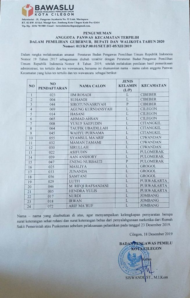 Pengumuman anggota Panwascam Terpilih Kota Cilegon tahun 2020